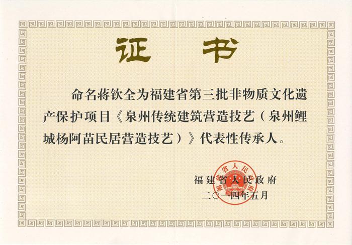 获福建省第三批非物质文化遗产保护项目“传统建筑营造技